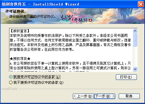 请仔细阅读《仙剑奇侠传五》许可证协议,如果您同意协议,勾选”我接受许可证中的条款“,并点击"下一步"按钮