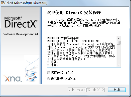 安装完毕后,将提示您安装DirectX,如果您确认您已安装过Dx9.0c及以上版本,您可以选择取消; 强烈推荐您安装以确保《仙剑奇侠传五》的正常运行。选择”我接受此协议“并点击"下一步"按钮