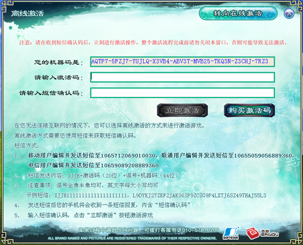 如果您无法访问互联网,您可以通过手机短信的方式进行游戏激活。